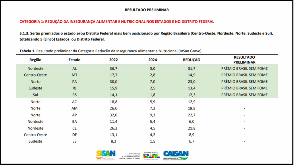 Divididos em três categorias, o prêmio reconheceu as políticas públicas voltadas à redução da insegurança alimentar e nutricional de cinco estados. Além de Alagoas, conquistaram a honraria o Mato Grosso, Pará, Rio de Janeiro e Rio Grande do Sul.