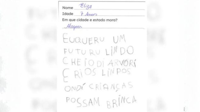 Mas foi uma mensagem vinda de Alagoas que deixou muitos olhos marejados. Com toda a doçura da escrita infantil, Eliza resumiu um desejo gigante: “futuru lindo cheio de árvores e rios linpos”. É a tal da esperança climática — a capacidade das crianças e adolescentes de enxergar um amanhã melhor, mesmo quando o mundo parece difícil.