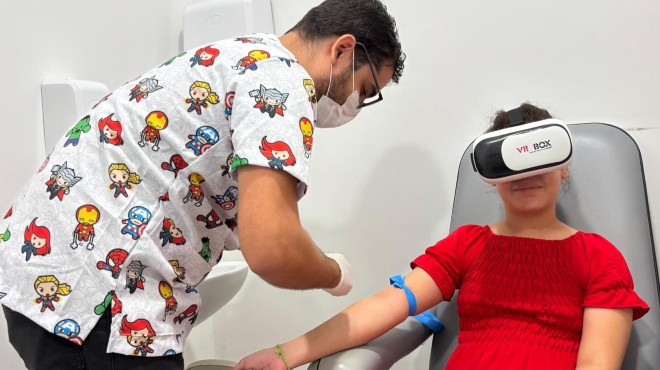 Enquanto a atenção está voltada para a aventura virtual, a equipe faz a coleta de sangue com muito mais tranquilidade e segurança.