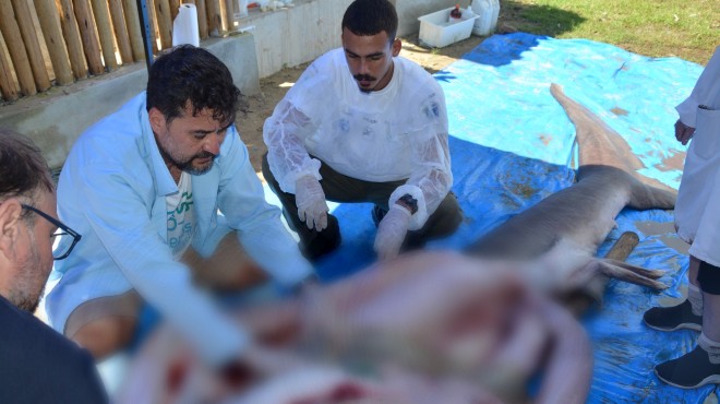 O animal foi fotografado e medido. Os cientistas fizeram a coleta de material para exames em laboratório, e de vértebras para conhecer a idade e o crescimento.