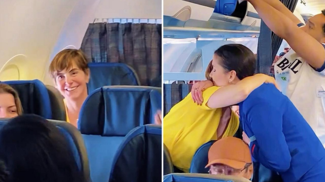 O comandante explicou que aquela não era uma operação comum: a comissária havia pedido para estar exatamente naquele voo para agradecer, diante de todos, a mulher que lhe devolveu a chance de seguir em frente.