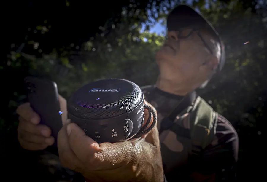 Ele carrega a tiracolo uma caixinha de som, dessas que se conectam ao celular via Bluetooth. Para atrair as aves, quando elas não se aproximam espontaneamente, Vieira recorre à tecnologia e reproduz o canto de determinada espécie, que já sabe existir naquela região.