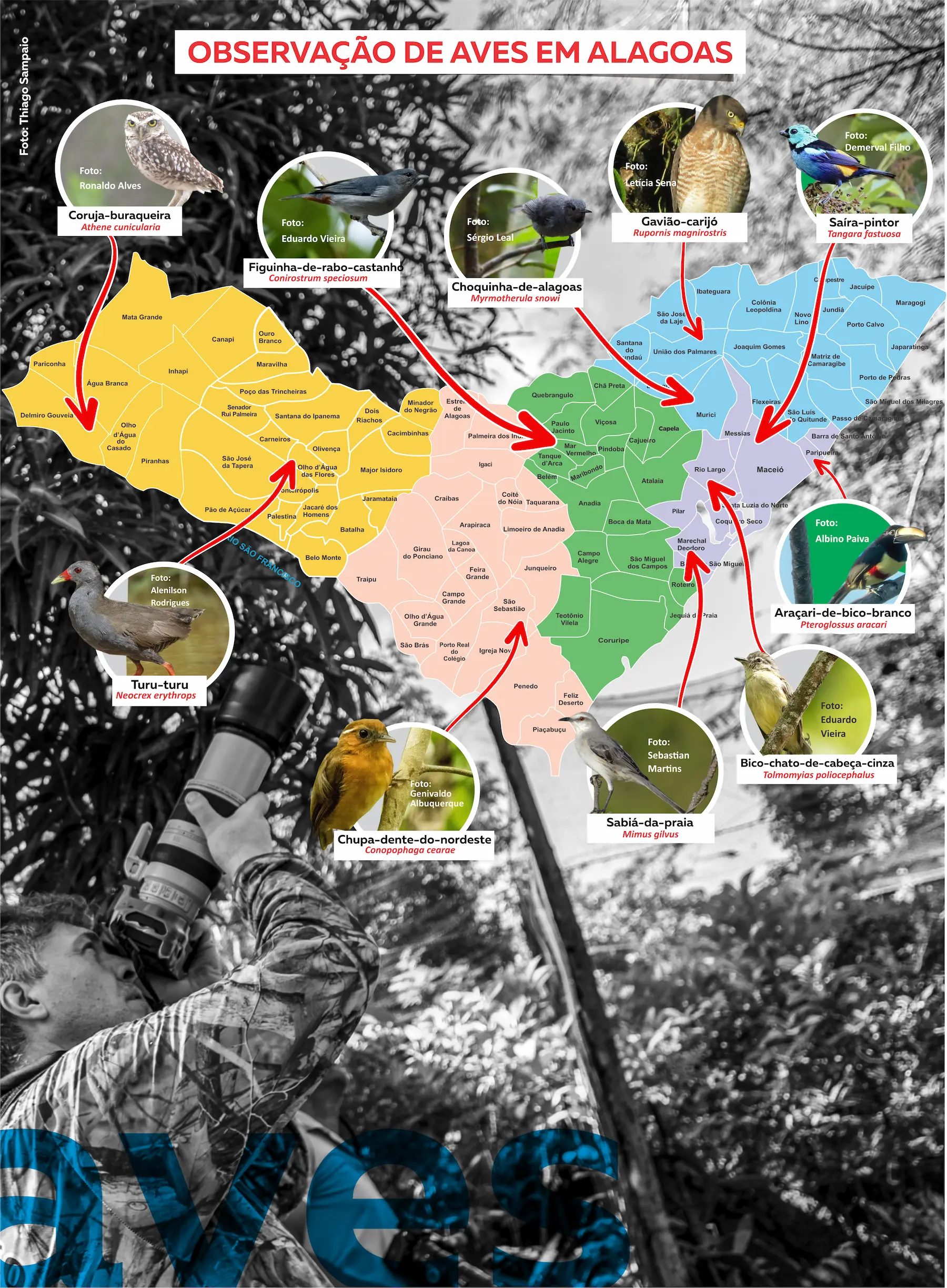 “O ornitólogo e guia de observação de aves Arthur Andrade, que atua há cerca de 5 anos com o turismo de avifauna na região, reforça que Alagoas vem se consolidando como um destino procurado cada vez mais para a atividade no Brasil, atraindo desde observadores brasileiros a estrangeiros que buscam observar espécies raras como a corujinha-de-alagoas e a choquinha-de-alagoas; as coloridas como a jandaia-verdadeira e udu-de-coroa-azul, além das espécies endêmicas e ameaçadas como o beija-flor-costa-violetas e o saíra-pintor”, cita Aline.