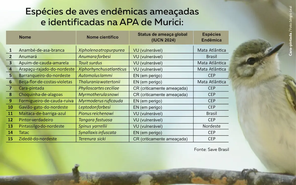 Maior Área de Proteção Ambiental terrestre de Alagoas, a APA de Murici integra o Centro de Endemismo Pernambuco (CEP). É refúgio para 15 espécies de aves ameaçadas de extinção.