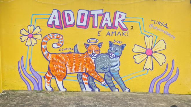 “Adotar é amar!”. Com essa mensagem, a artista mato-grossense radicada em Alagoas, Nathalia Ursa, fez uma homenagem aos gatos Cenoura e Dory, da organização não governamental SOS Pet Pinheiro, em Maceió.