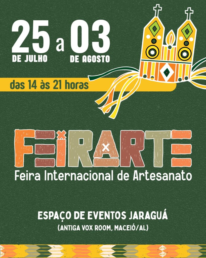 A Feira Internacional de Artesanato (Feirarte) tem início nesta sexta (25) no Espaço de Eventos Jaraguá (antiga Vox Room). O evento segue até o dia 3 de agosto, das 14h às 21h, com o tema: “O artesanato também é cultura popular!”.