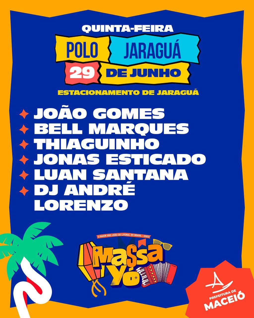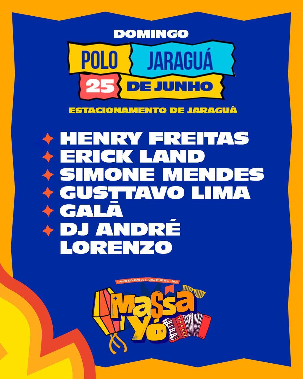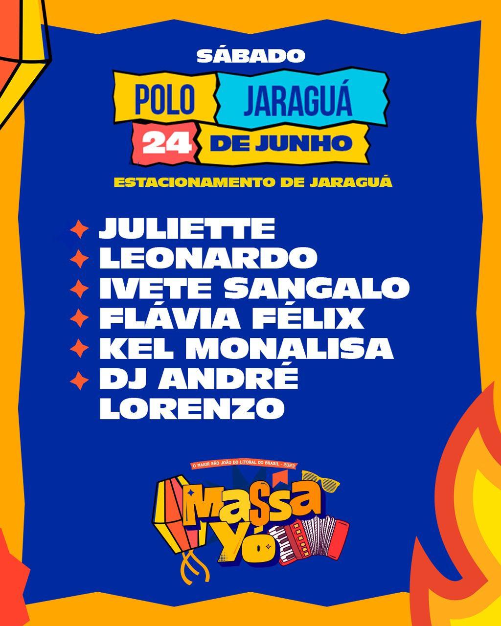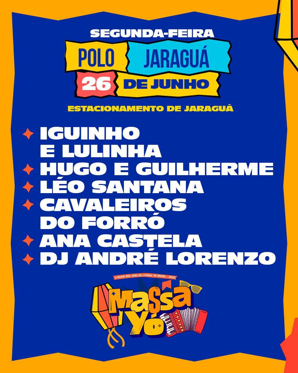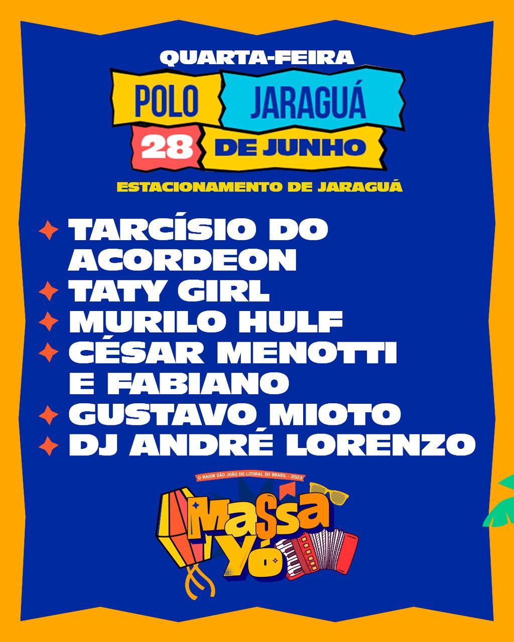 Polo Jaraguá, de 23 a 29 de junho: Alok, Barões da Pisadinha, Geraldo Cardoso, Zé Neto Leão, Dj André Lorenzo, Juliete, Leonardo, Ivete Sangalo, Flávia Félix, Kel Monalisa, Henry Freitas, Erick Land, Simone Mendes, Gustavo Lima, Galã, Iguinho e Lulinha, Hugo e Guilherme, Léo Santana, Cavaleiros do Forró, Ana Castela, Zé Vaqueiro, Zezé di Camargo e Luciano, Wesley Safadão, Mano Walter, Flor de Mandacaru, Tarcísio do Acordeon, Taty Girl, Murilo Hulf, César Menotti e Fabiano, Gustavo Mioto, João Gomes, Bell Marques, Thiaguinho, Jonas Esticado e Luan Santana.