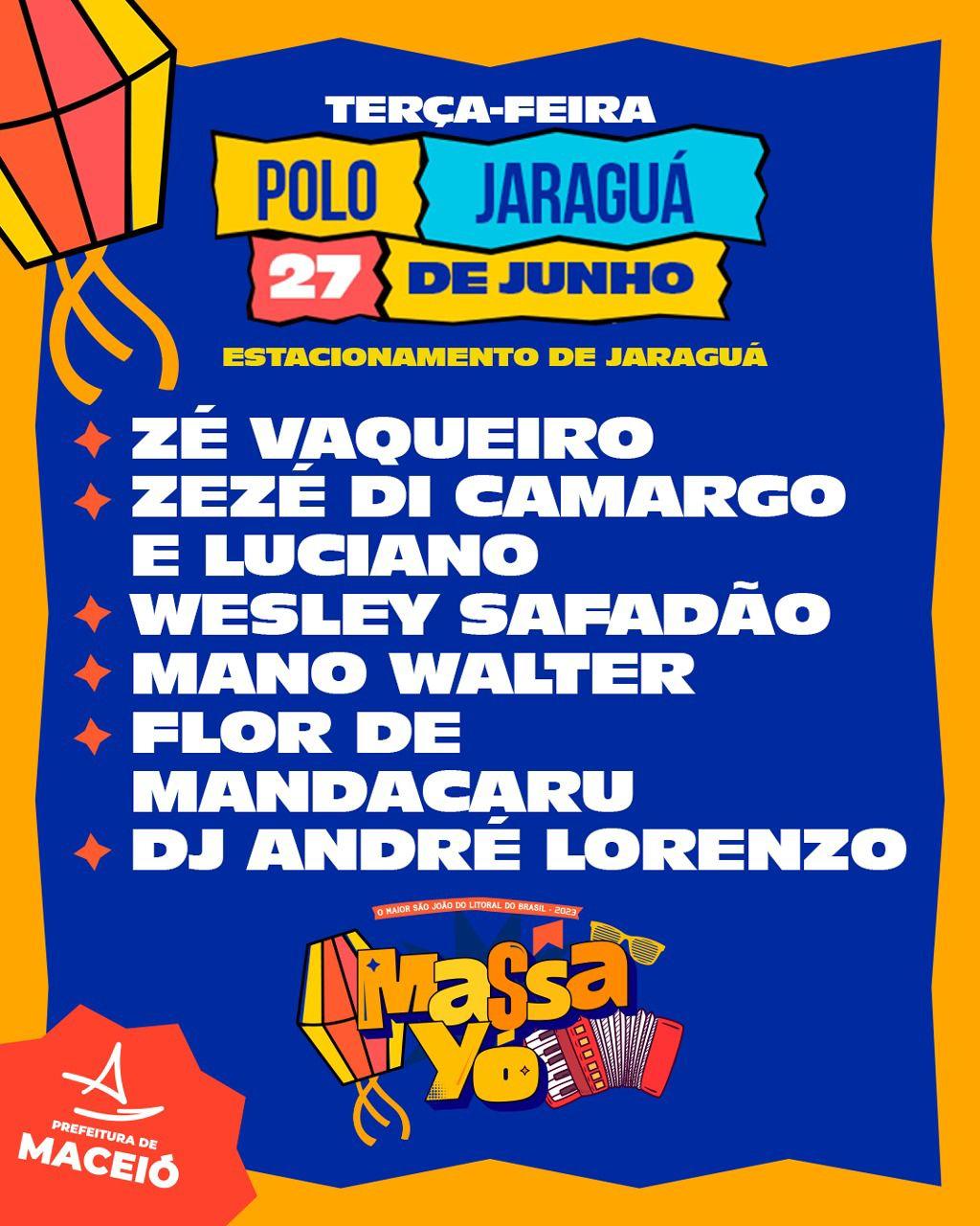 Polo Benedito Bentes, de 30 de junho a 2 de julho: Alisson Cunha; Caviar com Rapadura; Lipe Lucena; Marcinho Sensação; Japinha Conde; Taty Vaqueira; Tierry; Zezo, Raí Saia Rodada e Luan Estilizado; entre outras atrações;