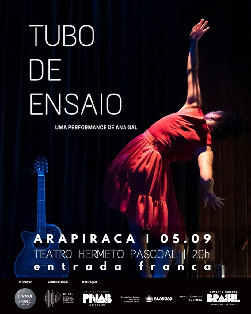 A cantora e performer Ana Gal leva ao público de Arapiraca o espetáculo “Tubo de Ensaio”, uma apresentação solo que mistura música, dança, textos e experimentações cênicas.