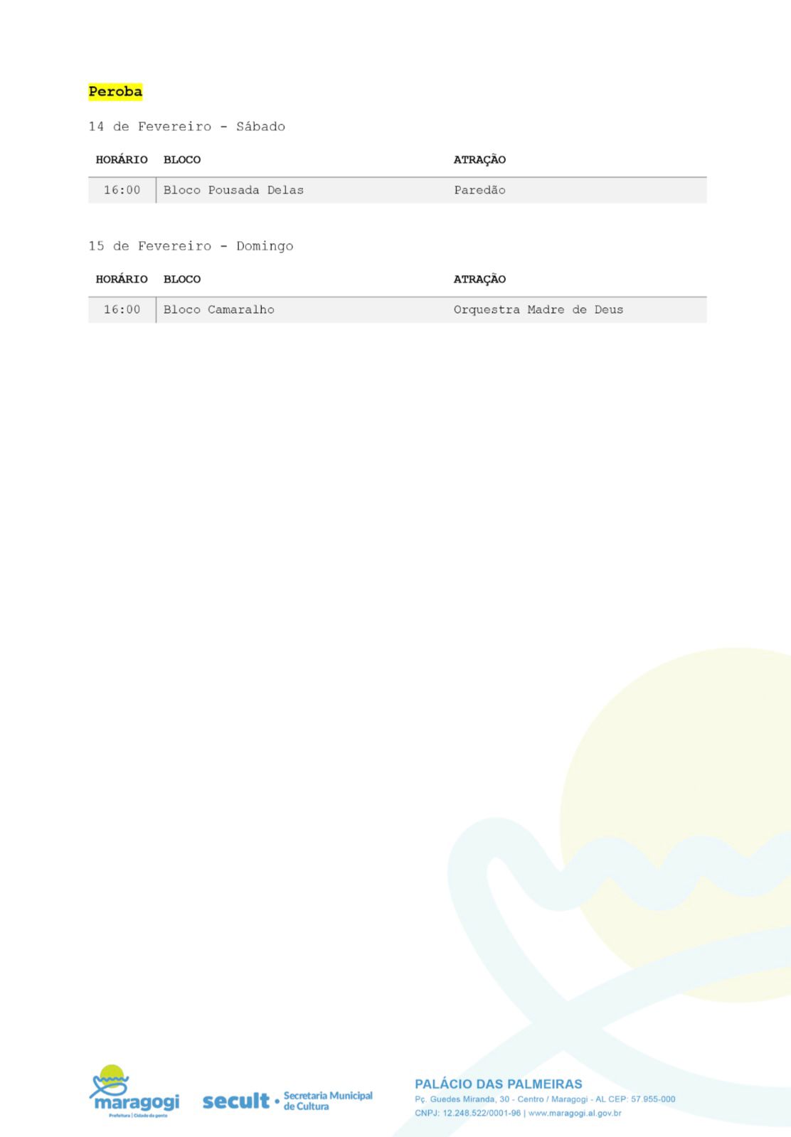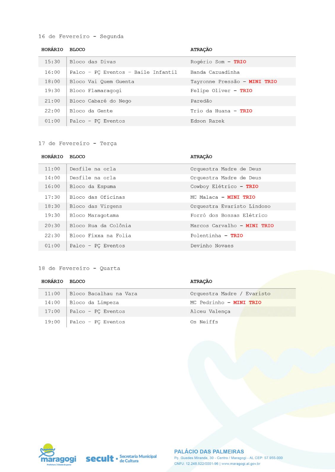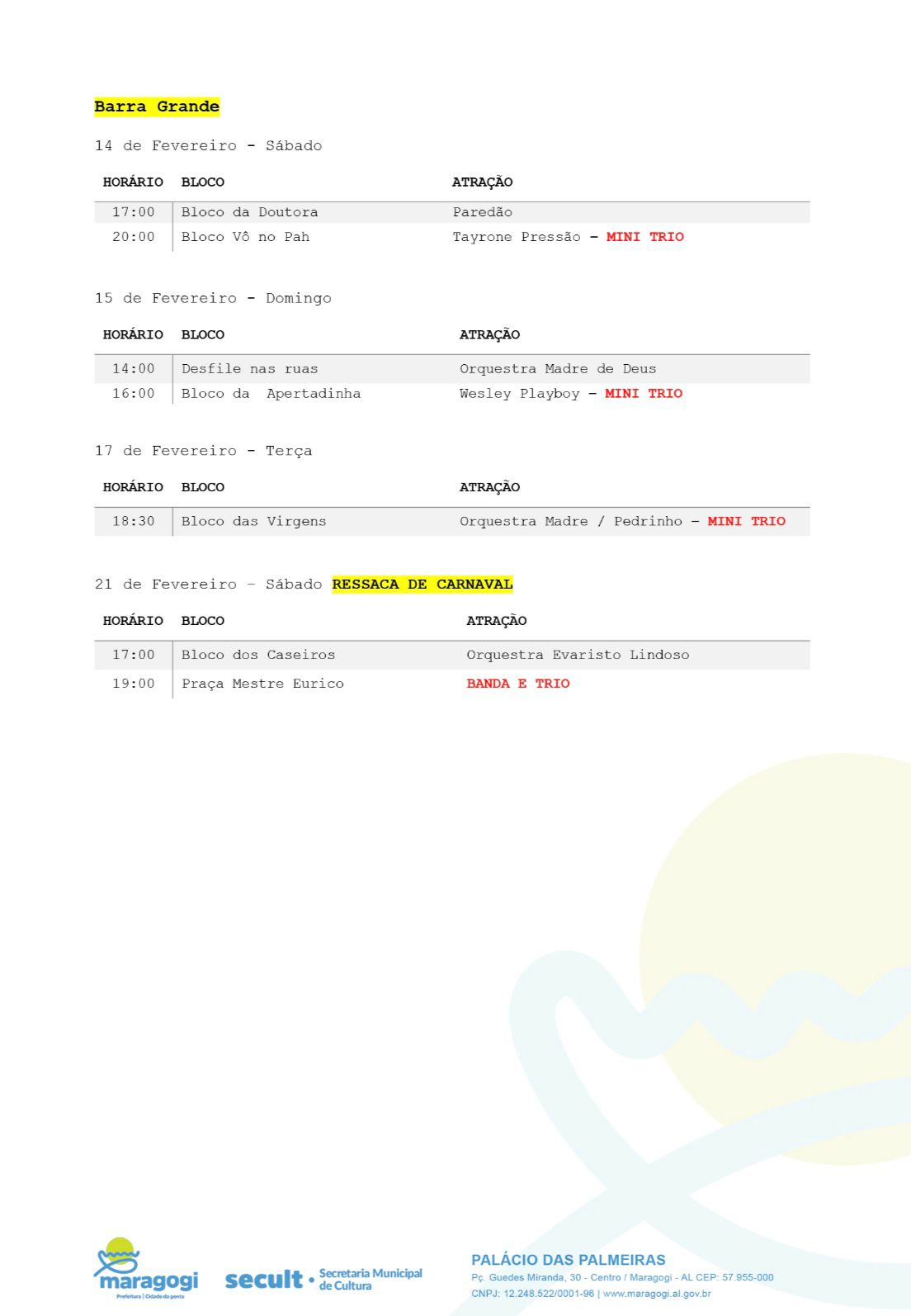 Maragogi já botou o bloco na rua! A Prefeitura Municipal, por meio da Secretaria Municipal de Cultura, Esporte e Eventos, apresentou nessa terça-feira (3), no Palácio das Palmeiras, a programação do Carnaval 2026.