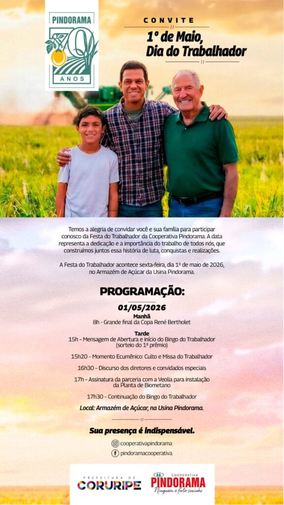 A Cooperativa Pindorama realiza, nesta sexta-feira (1º de maio), em Coruripe, a tradicional Festa do Trabalhador com uma programação que inclui missa e culto evangélico, final da Copa René Bertholet, sorteio de prêmios e show, além do anúncio de uma parceria com a empresa Veolia para a produção de biometano a partir da vinhaça do etanol.