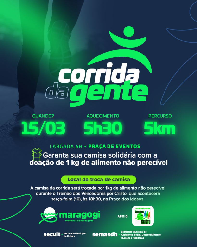 A Prefeitura de Maragogi promove, no próximo domingo (15), a Corrida da Gente, iniciativa que une esporte, saúde e solidariedade em um momento de integração para toda a comunidade.